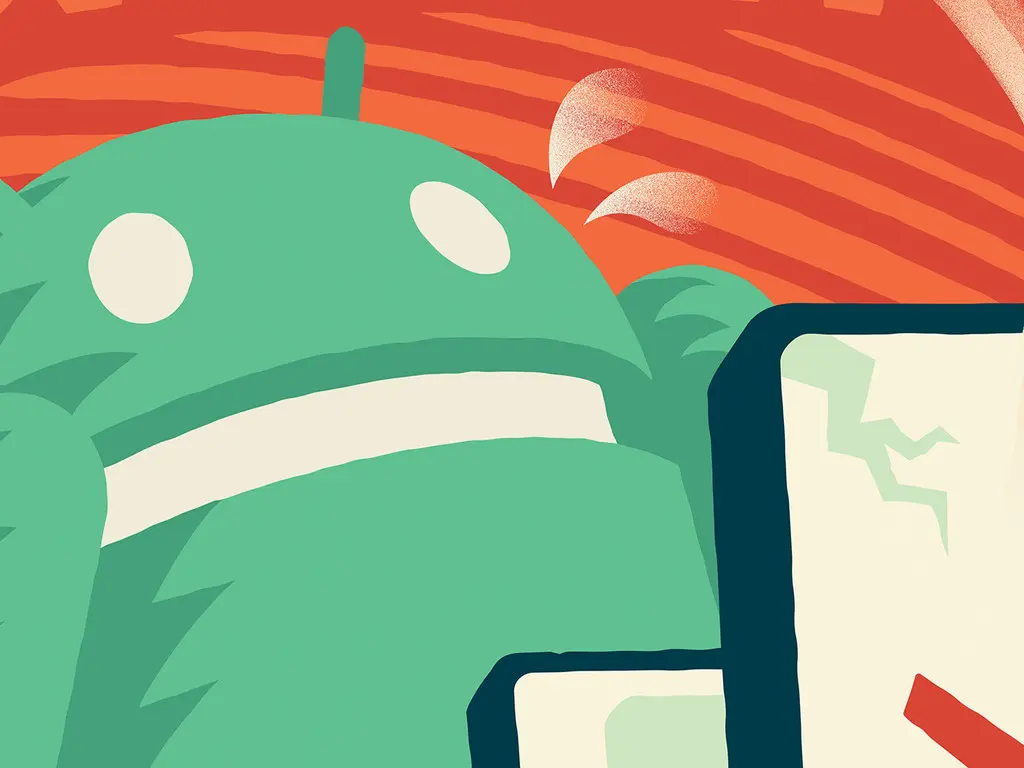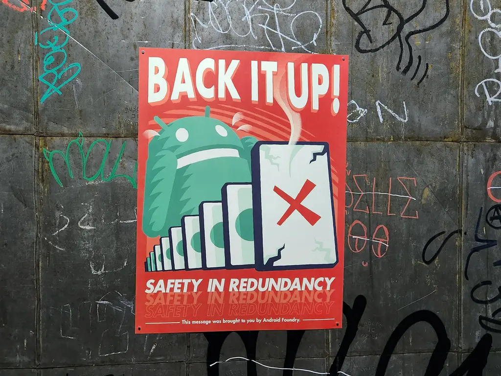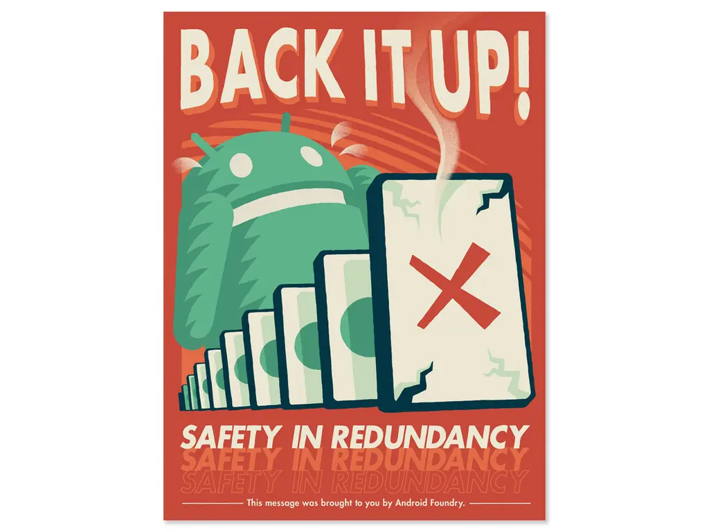 Back It Up! is a orange poster with an Iconic-styled Bugdroid rushing to a device that has not been backed up.