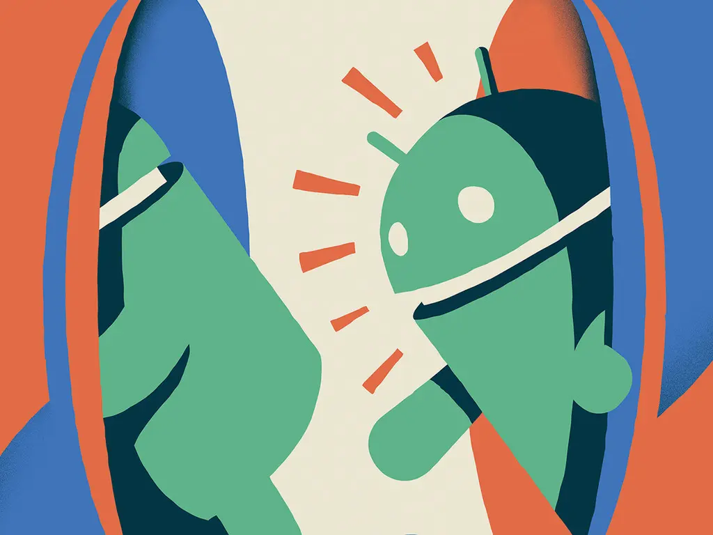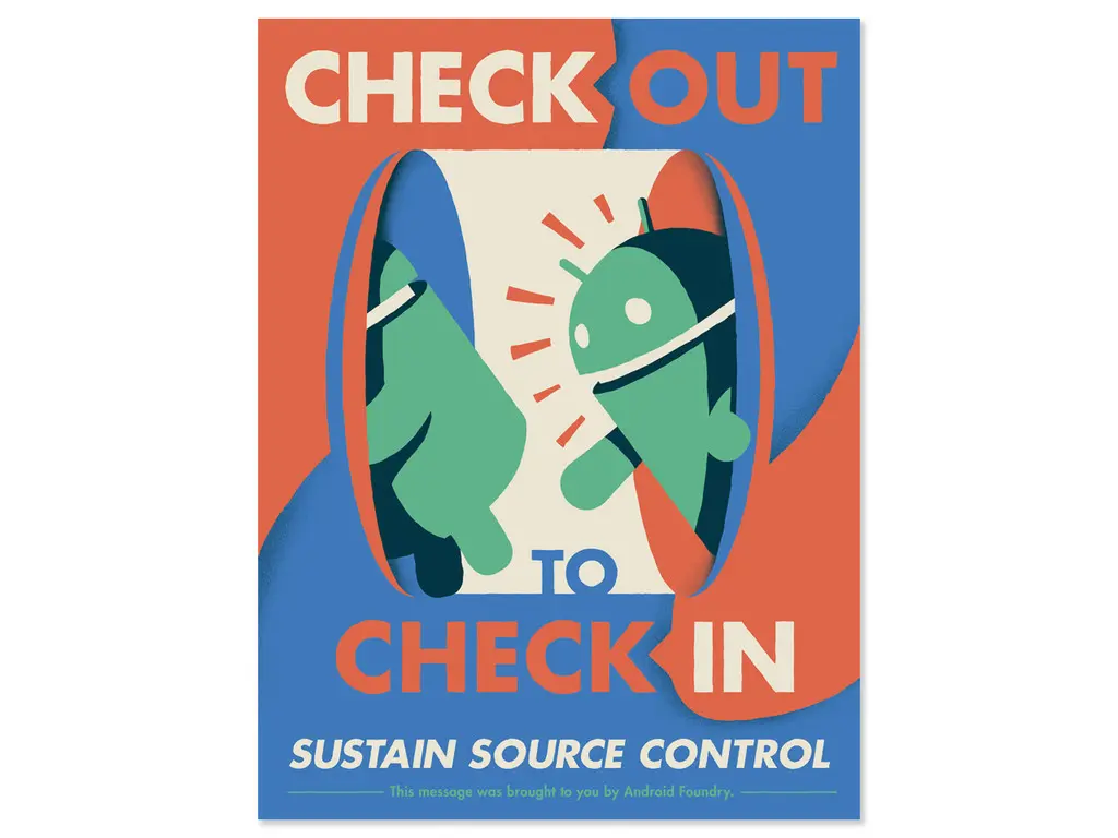 Check out to Check In! is blue and orange poster of an Iconic-styled Bugdroid going through holes ("checking out").