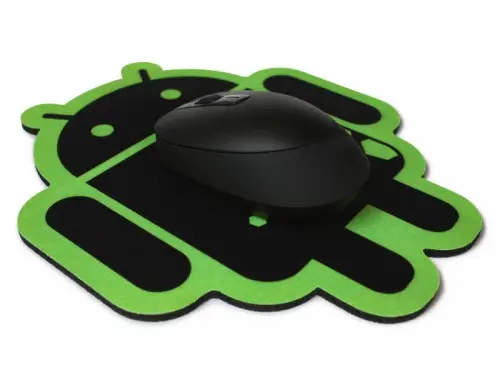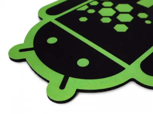 The Hexcode Android Mouse Pad is decorated version of the cloth mouse pad, featuring green-bordered black Bugdroid with green hexagons. It is a mouse pad with a cloth surface and a non-slip foam rubber back.