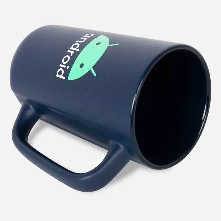 The Android Stoneware Mug is a tall navy mug with the Iconic-styled Bugdroid head and wormark.