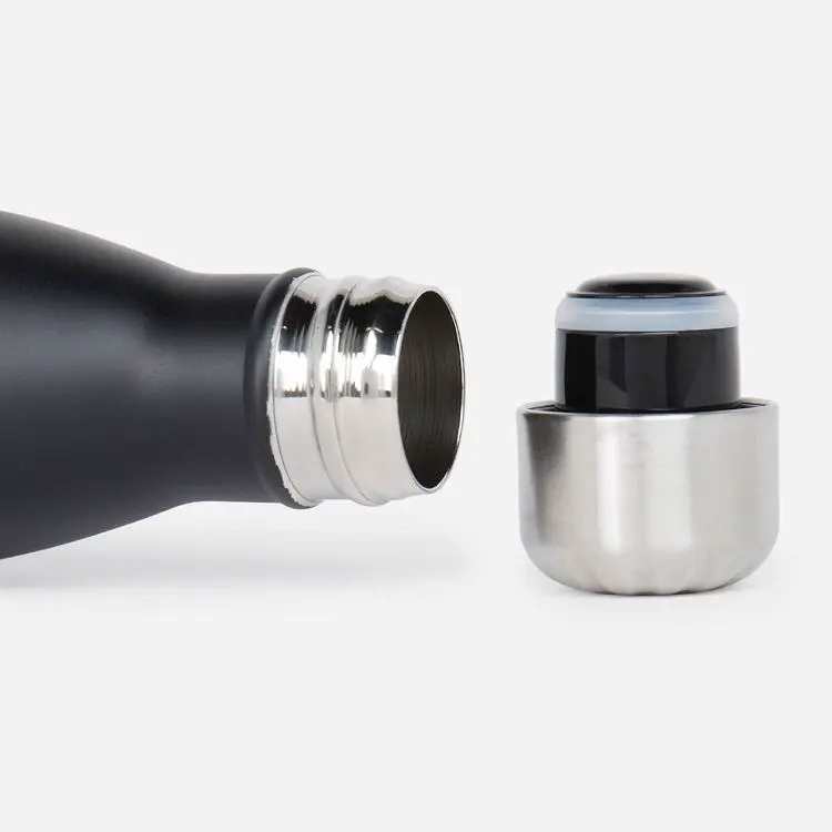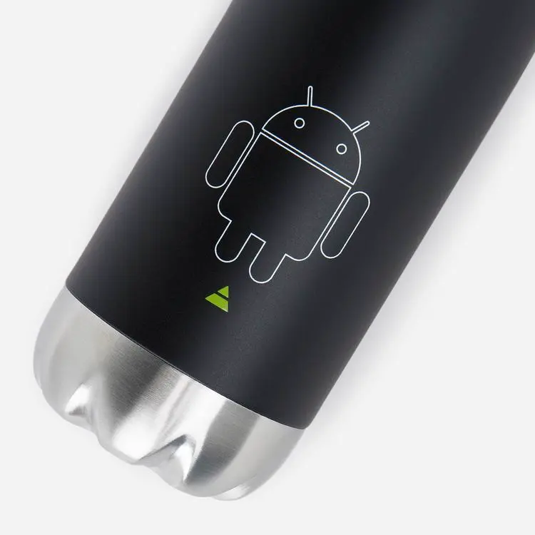 The Android Trace Bottle is black covered stainless steel bottle with a white-outlined Bugdroid alongside
