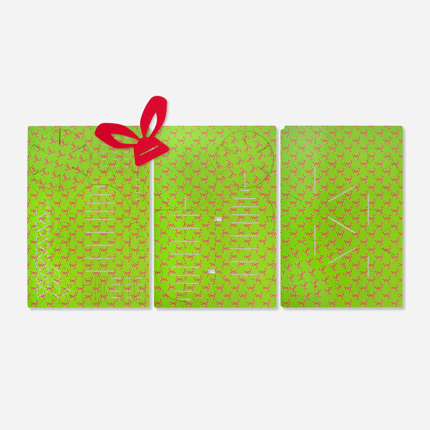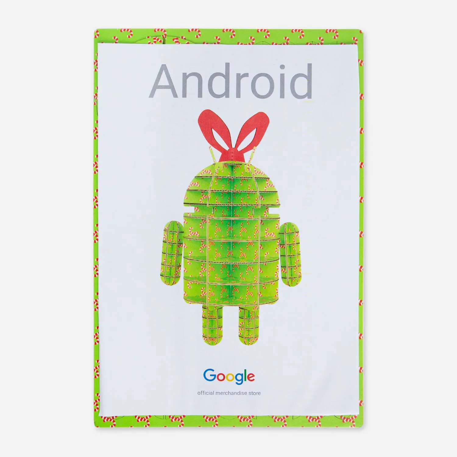 Candy Cane Android Cardboard Sculpture is a cardboard statue of the classic Bugdroid, but with a decorated body of Candy Canes finished with a red bow. It is built by assembling pieces from three sheets of cardboard.