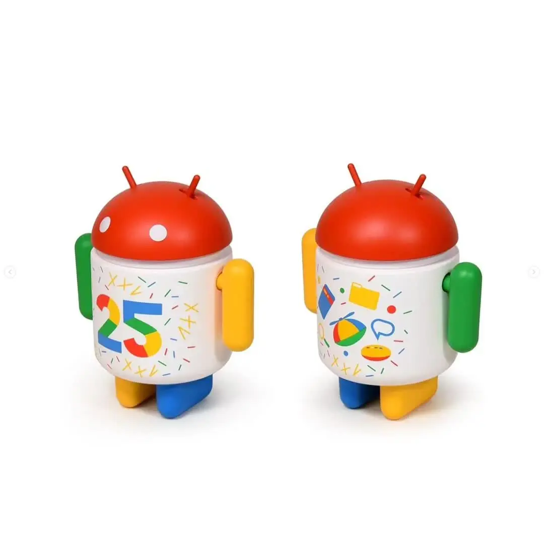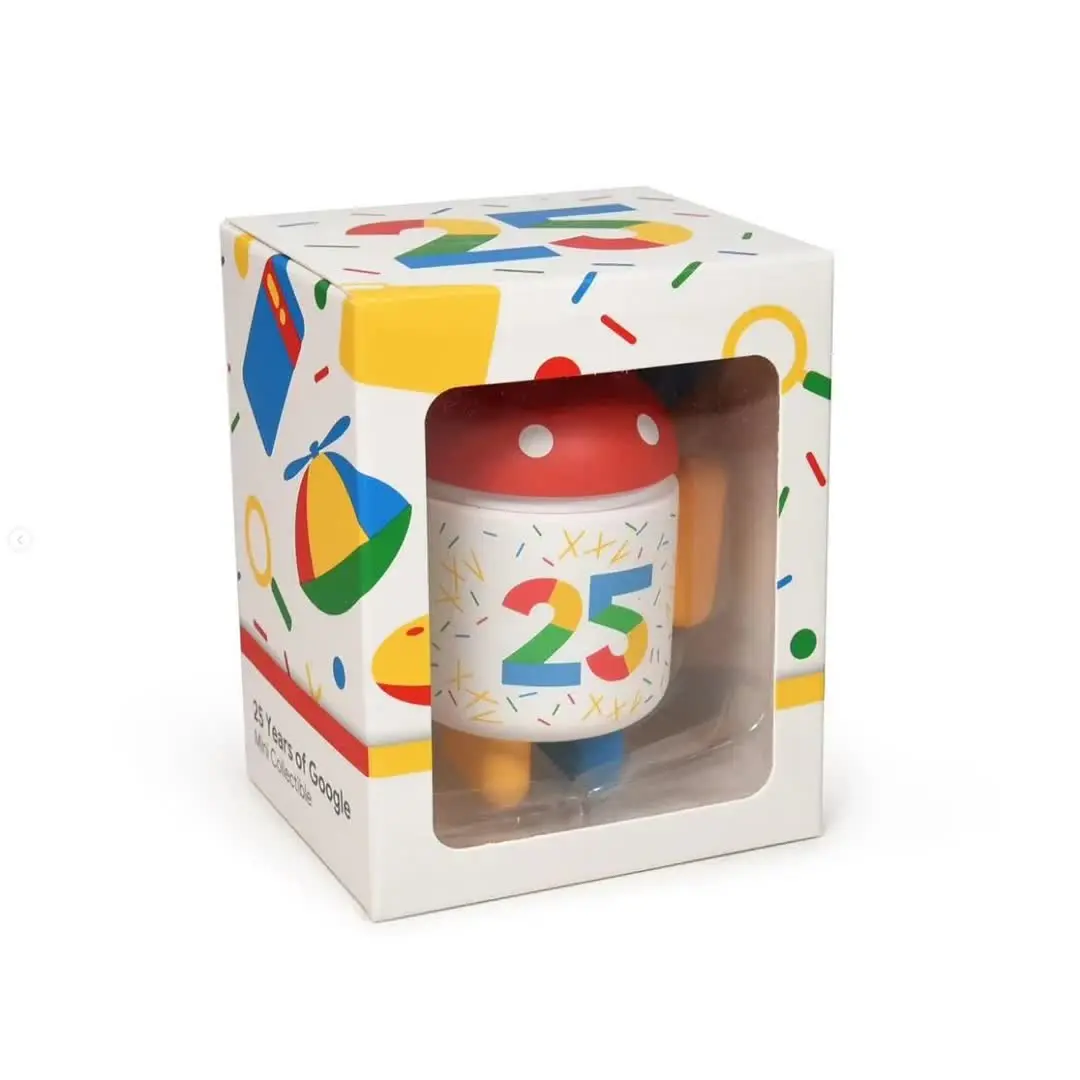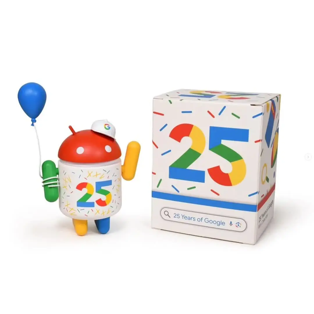 The 25 Years of Google figure is a multi-colored Bugdroid with a party hat and blue balloon designed for Google's 25th anniversary.