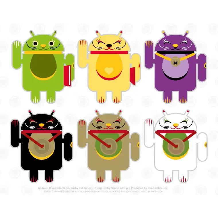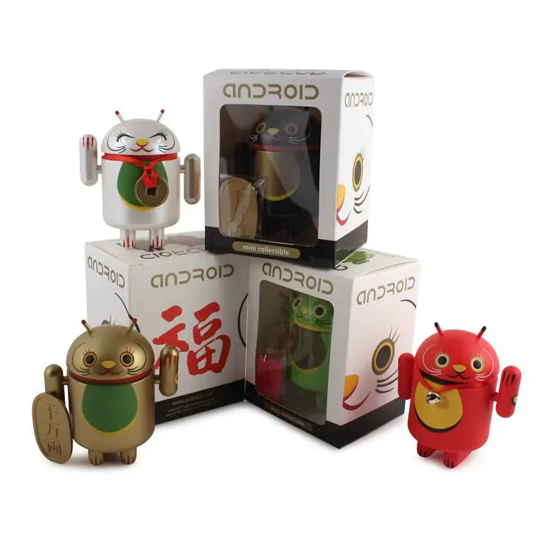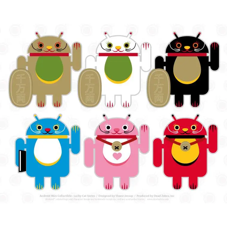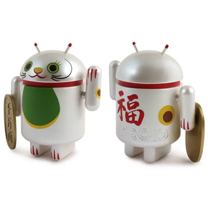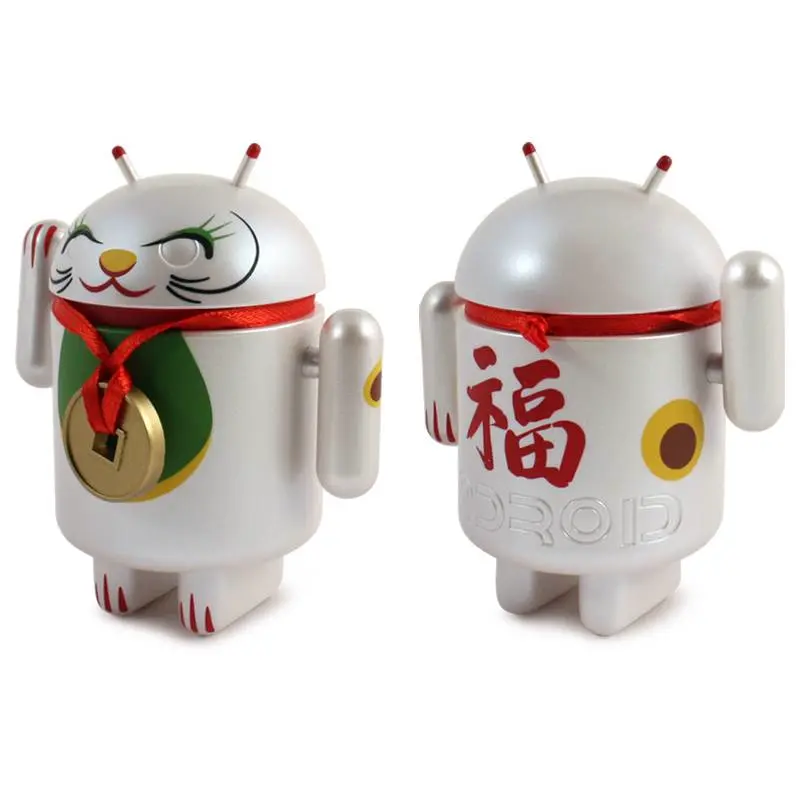 Introducing the Android mini collectibles Lucky Cat Series! Designed by artist Shane Jessup, these adorable Androids welcome wealth, prosperity and protection into your home or business. Each window-boxed Lucky Cat Android features an accessory and a swinging arm.