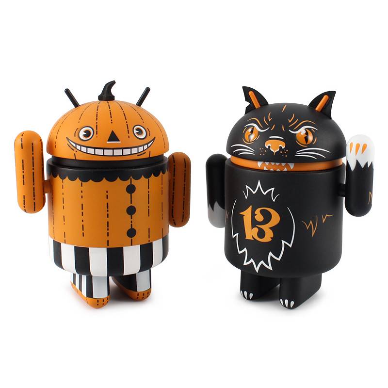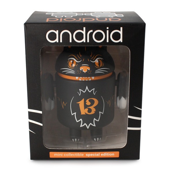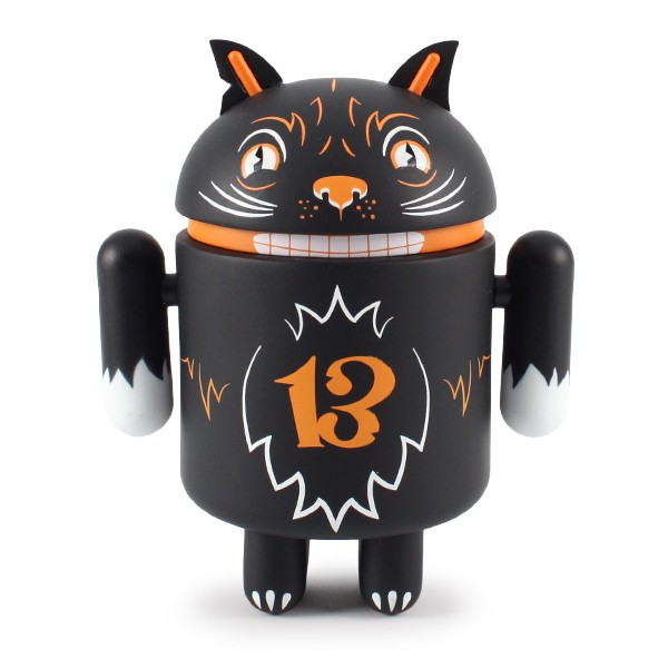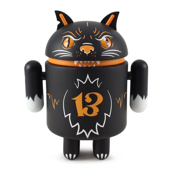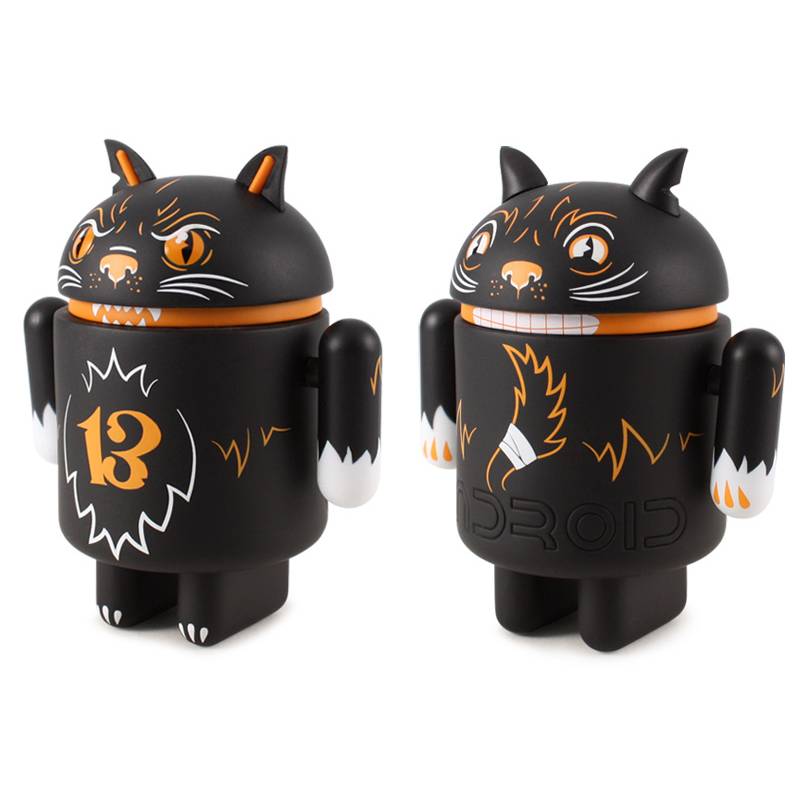 Lucky Lucy is a oragne-accented black cat Bugdroid figurine, it is one of the figures that has a double sided design.