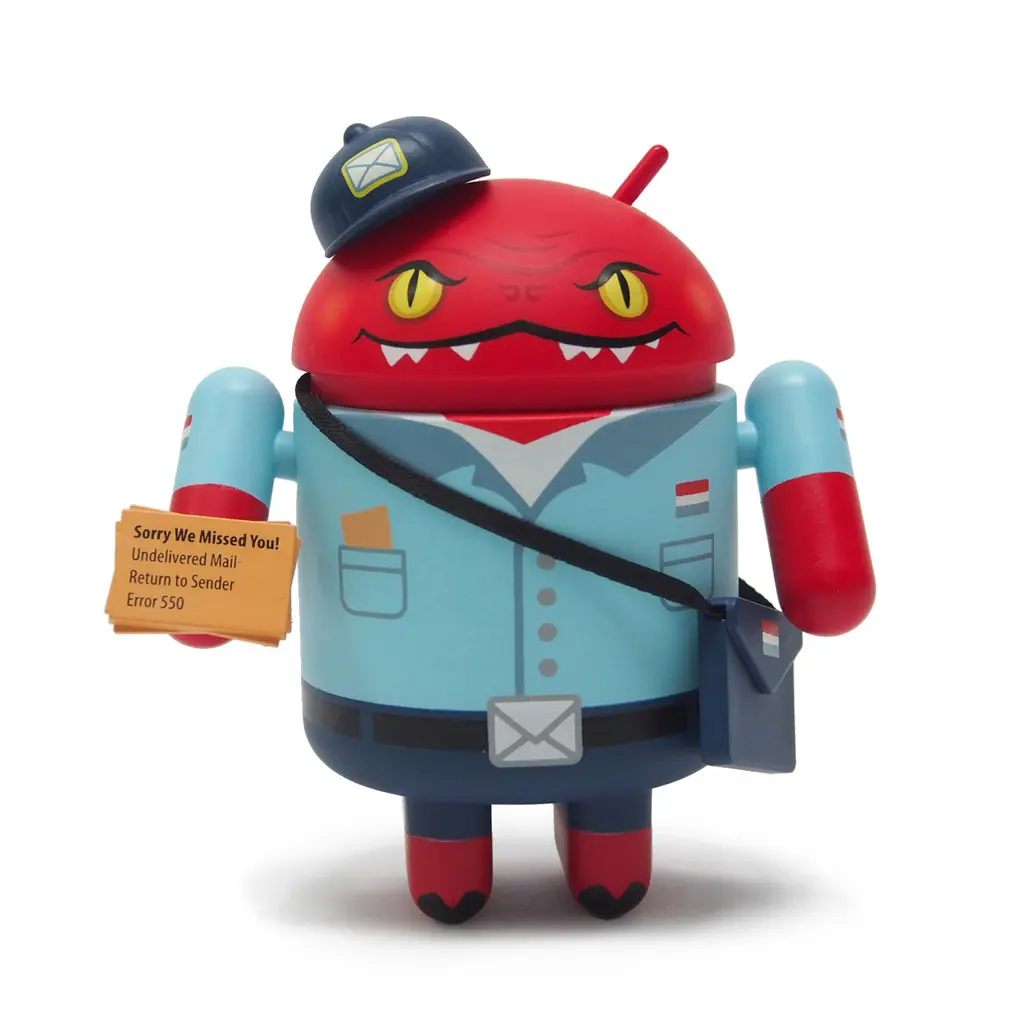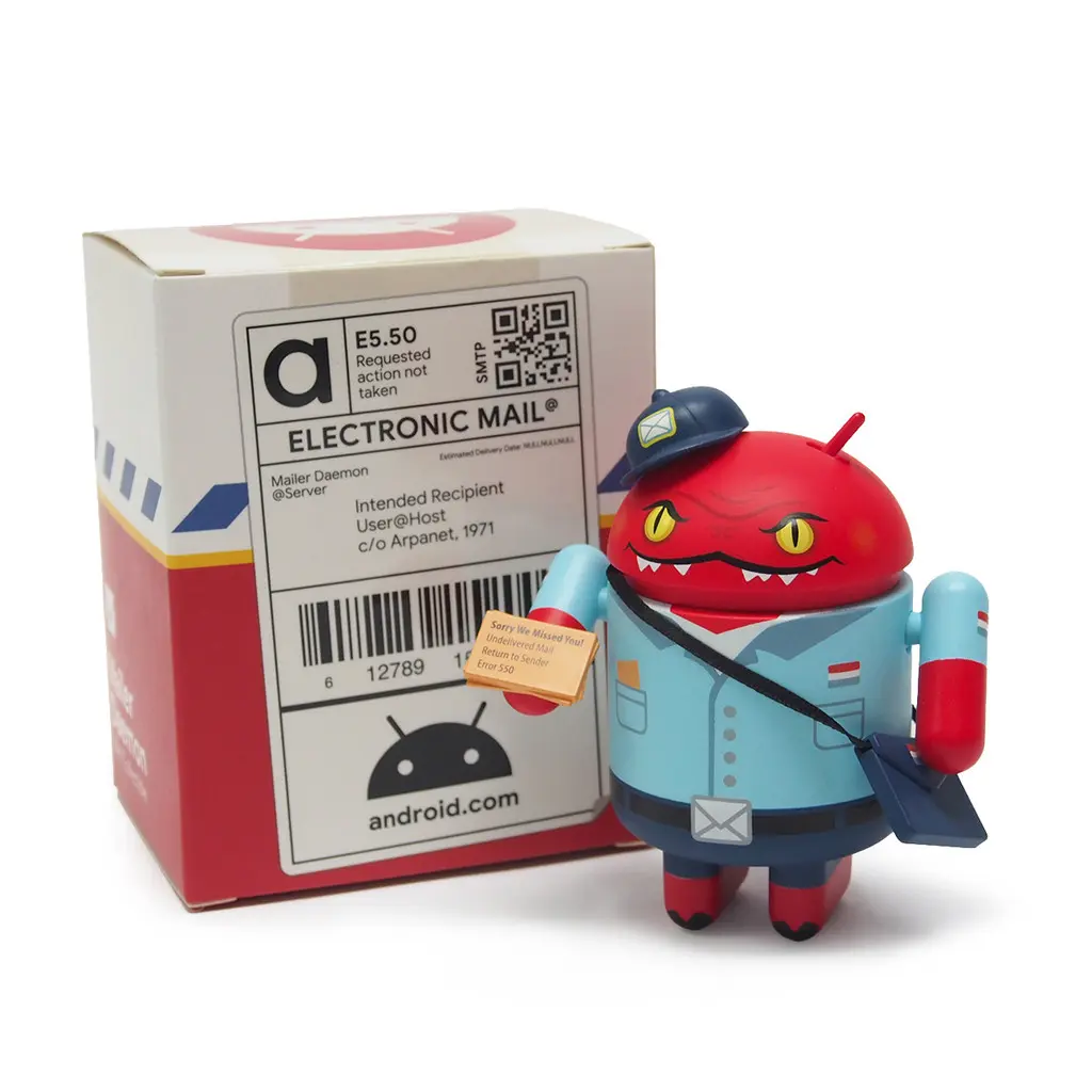 The Mailer Daemon figure is a demon mail delivery bot that failed to deliver mail, carrying its pink slip with itself. The pink slip contains a techie joke and the overall design of the product is themed after a horror movie.