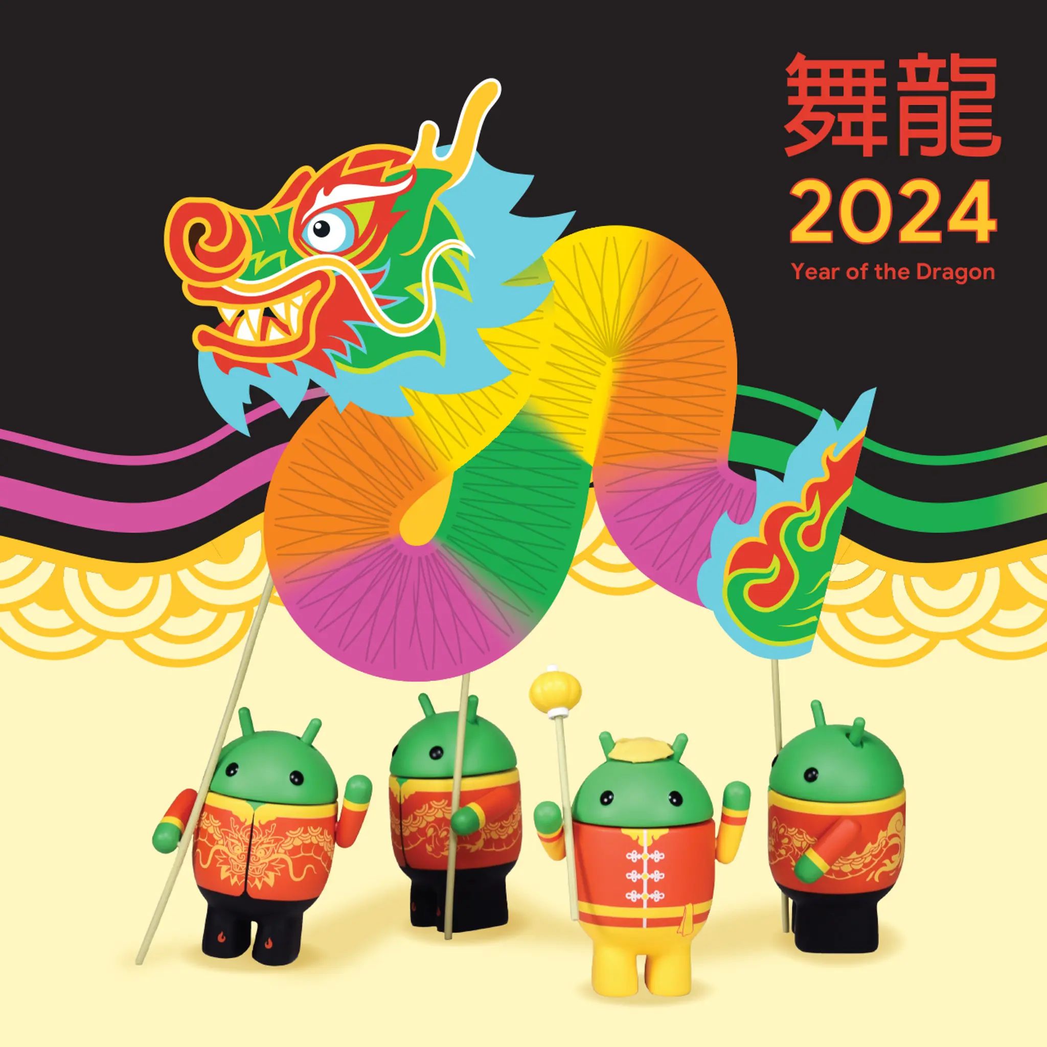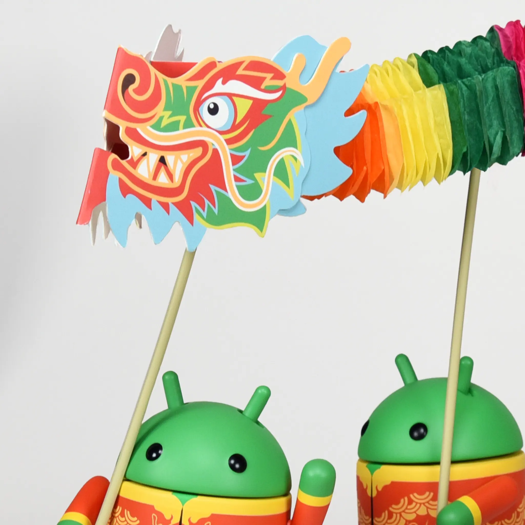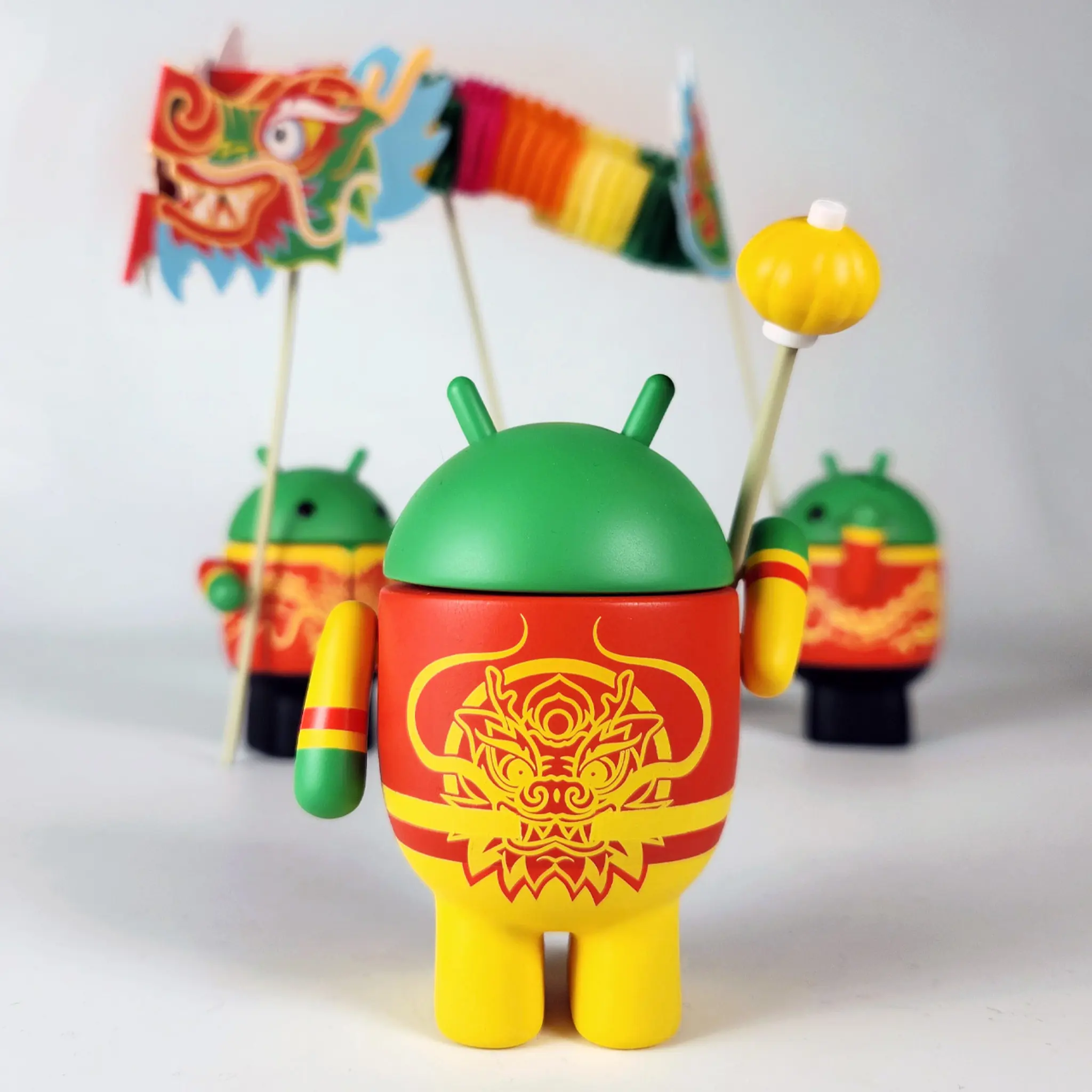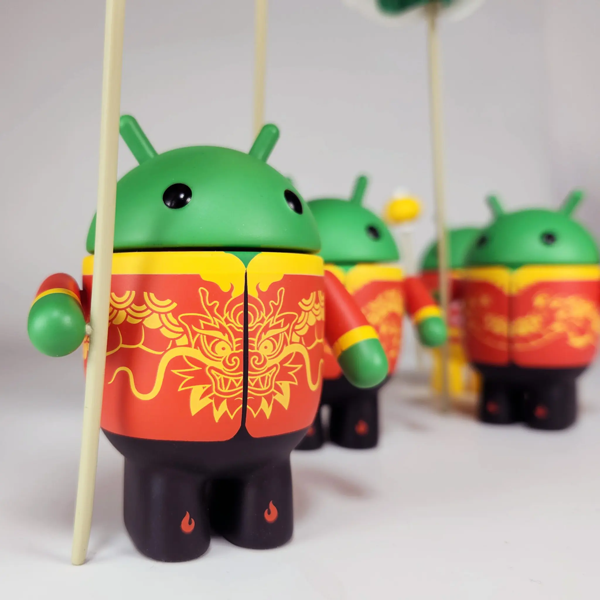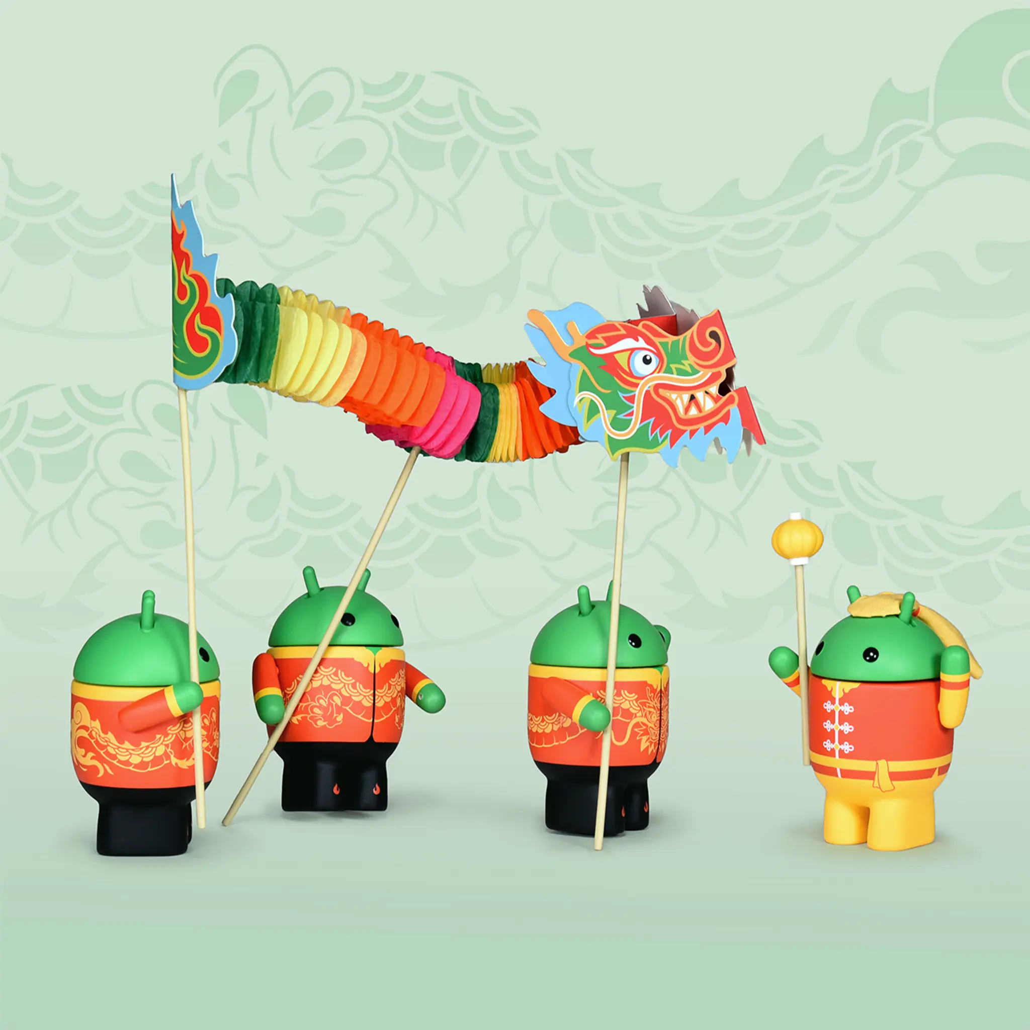 The 2024 Year of the Dragon Set contains four of the modern Bugdroids celebrating the Year of the Dragon. The set includes an accordion dragon and a pearl staff.