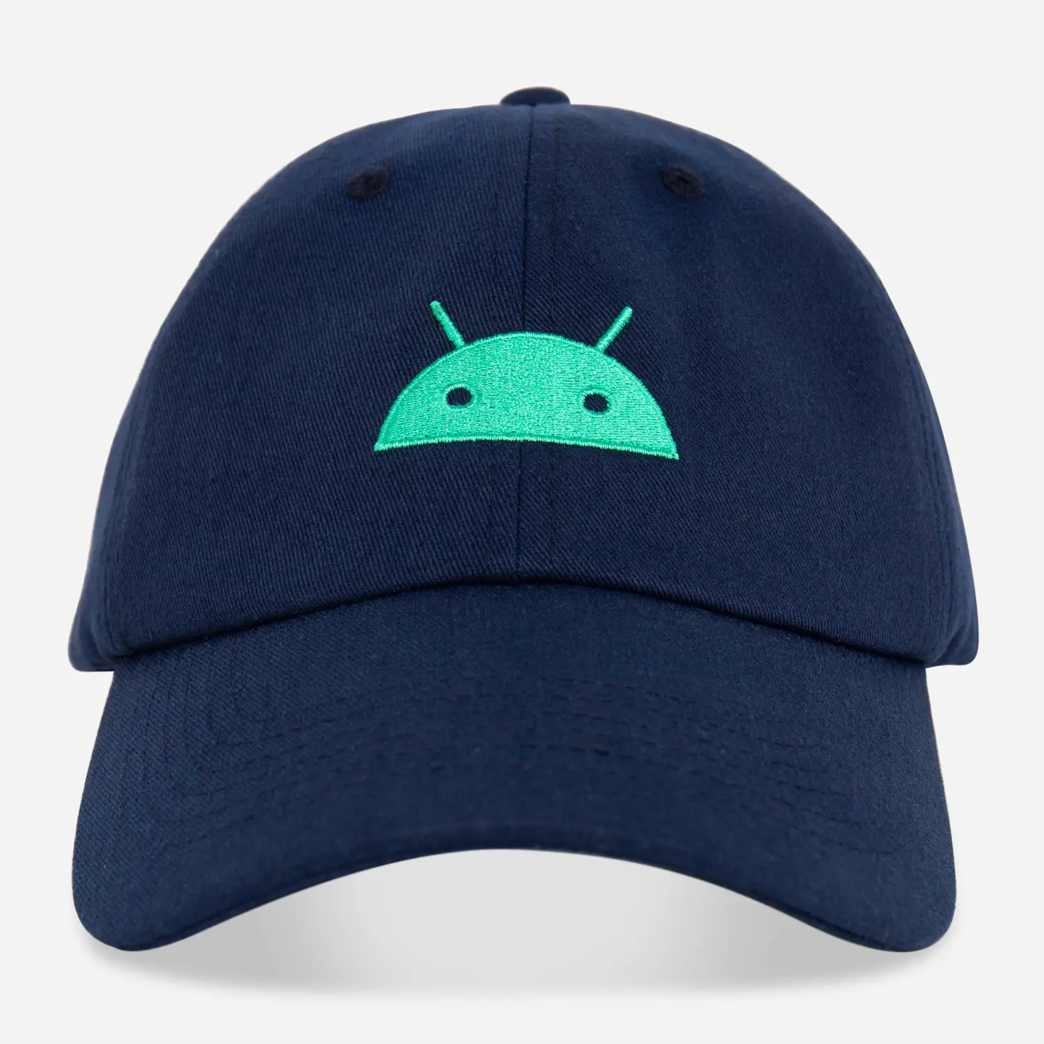 Android Iconic Hat Green is a navy cap with a green Iconic-styled Bugdroid head on it.
