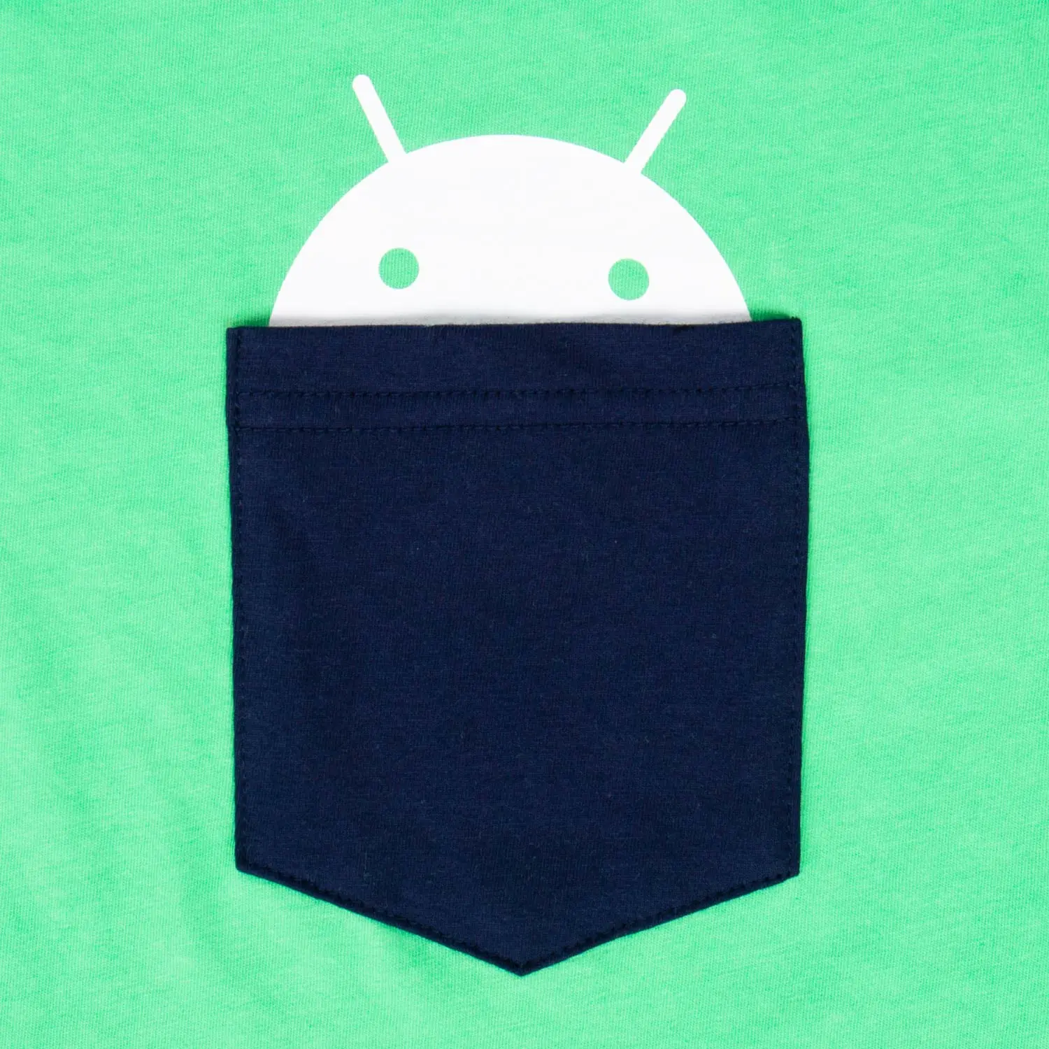 The Android Pocket Tee Green is a bright green shirt with a navy blue pocket with an Iconic-styled Bugdroid head peeking out of it. This shirt has one variation (Youth).