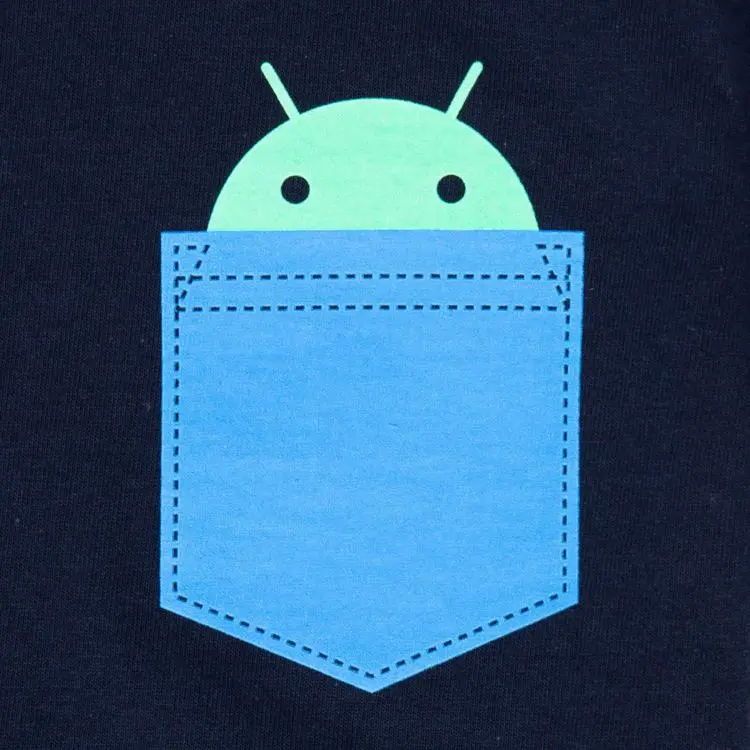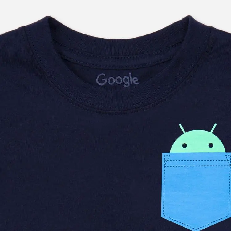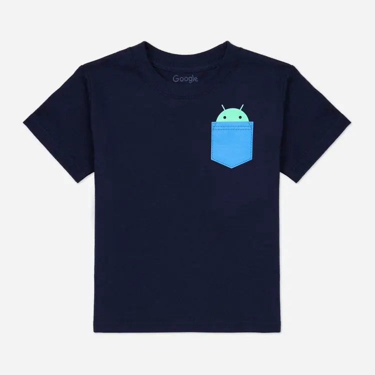 The Android Pocket Toddler Tee Navy is a smaller variation of the Android Pocket Tee Navy. A navy blue shirt with a blue pocket with an Iconic-styled Bugdroid head peeking out of it.
