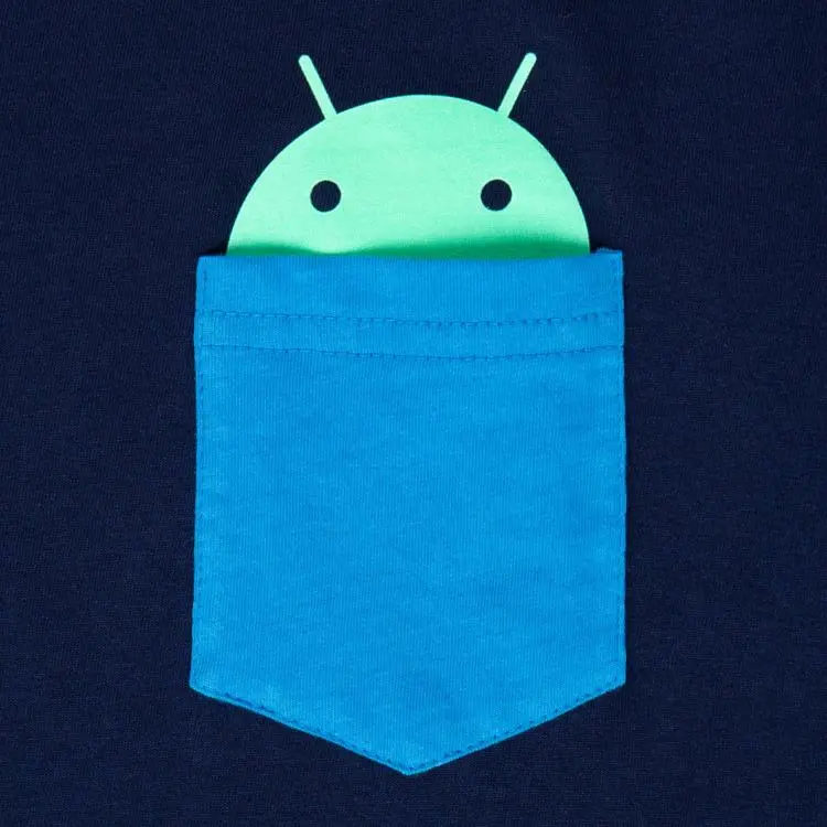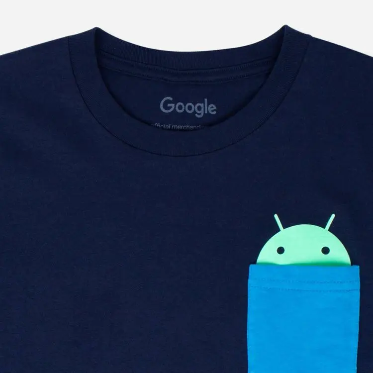 The Android Pocket Youth Tee Navy is a small variation of the Android Pocket Tee Navy. A navy blue shirt with a blue pocket with an Iconic-styled Bugdroid head peeking out of it.