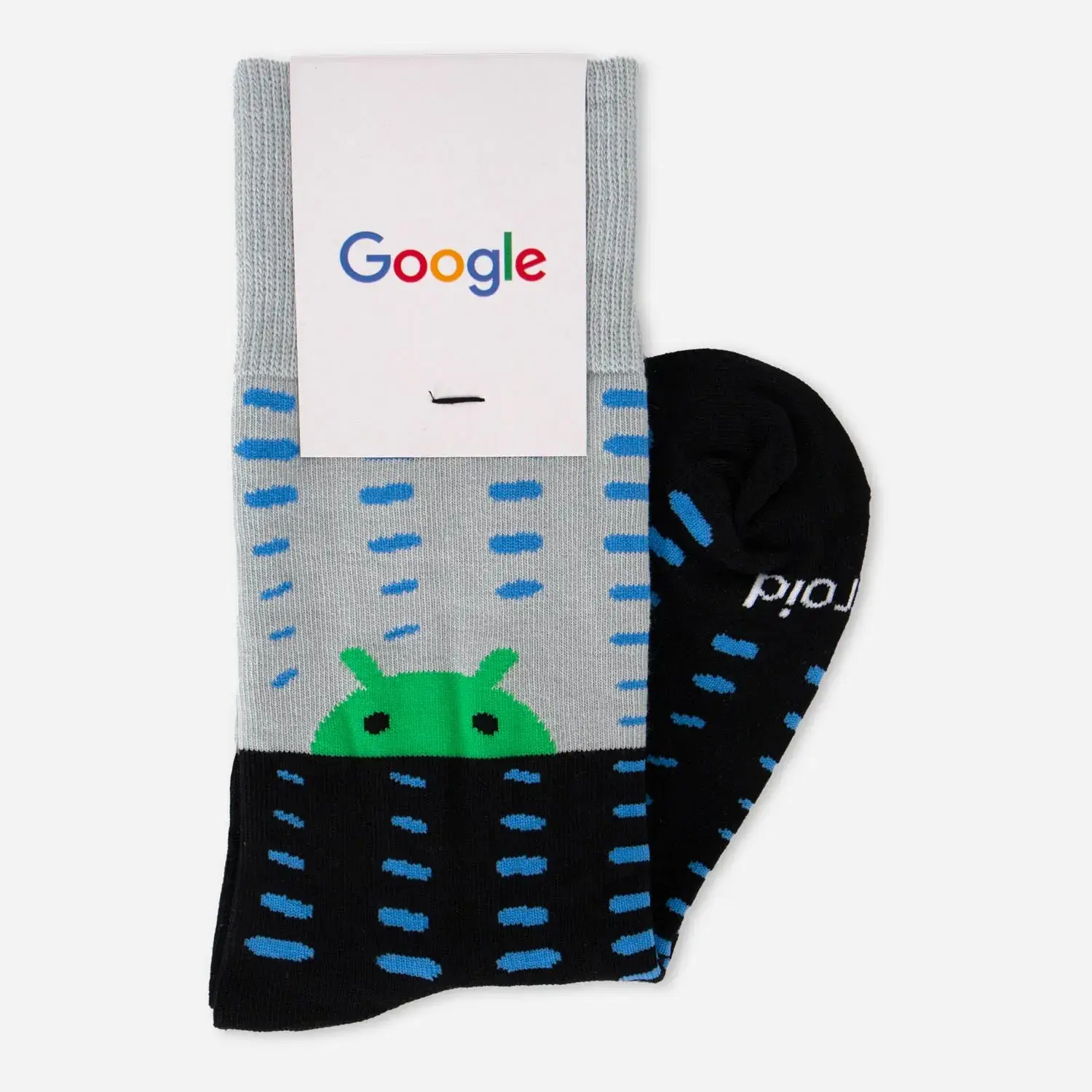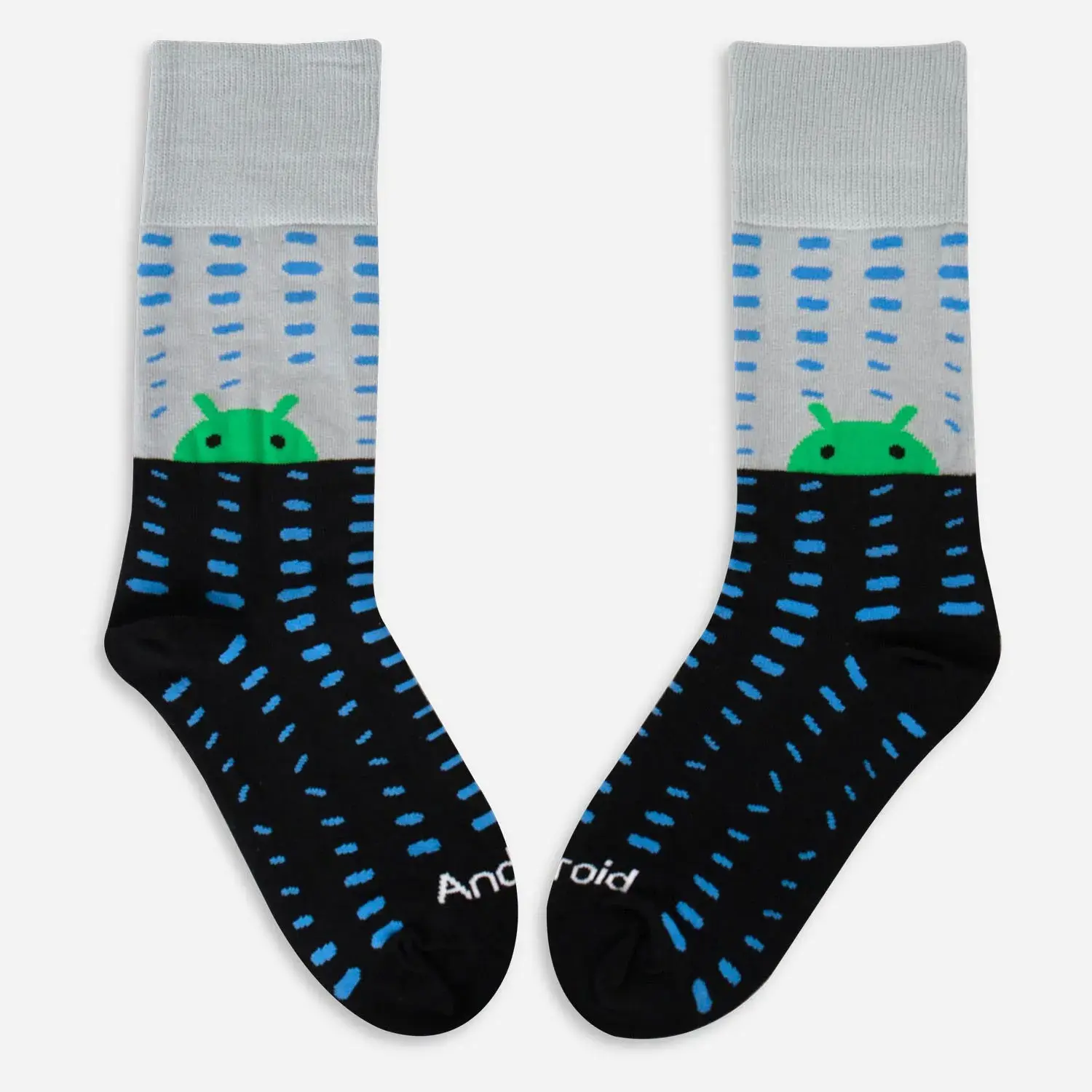 The Android Night and Day Socks are half grey and black socks. Both sides have blue patterns on them. The modern Bugdroid head is on the grey side, and the wordmark is on the black side.
