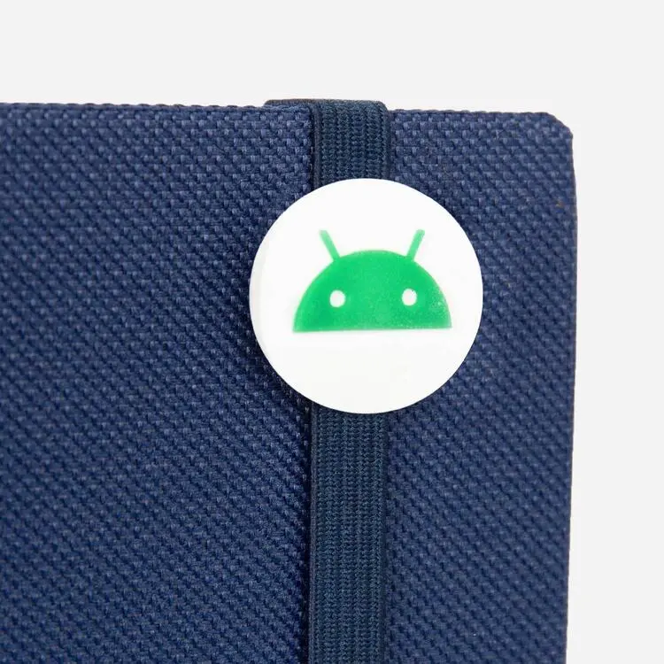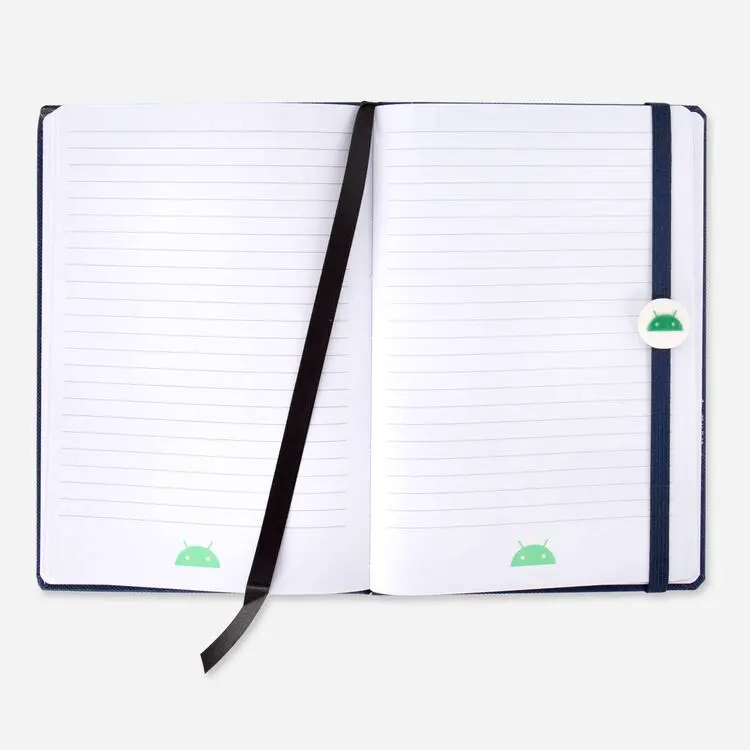 The Android Classic Notebook is a navy blue notebook with a cover ribbon. The ribbon has a badge with an Iconic-styled Bugdroid head.