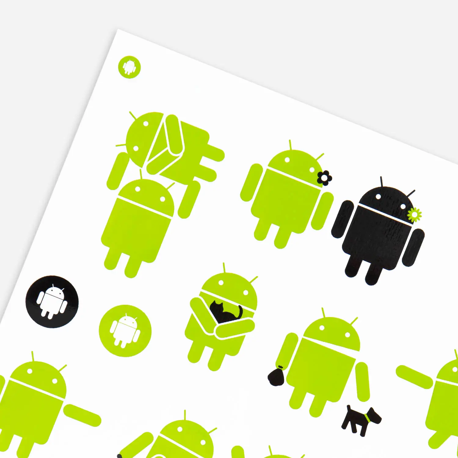 Android Large Removable Sticker Sheet is a collection of Bugdroid emoting stickers. This contains of green and black Bugdroids doing stuff together like high-fiving or skateboarding. Also shown are pets!